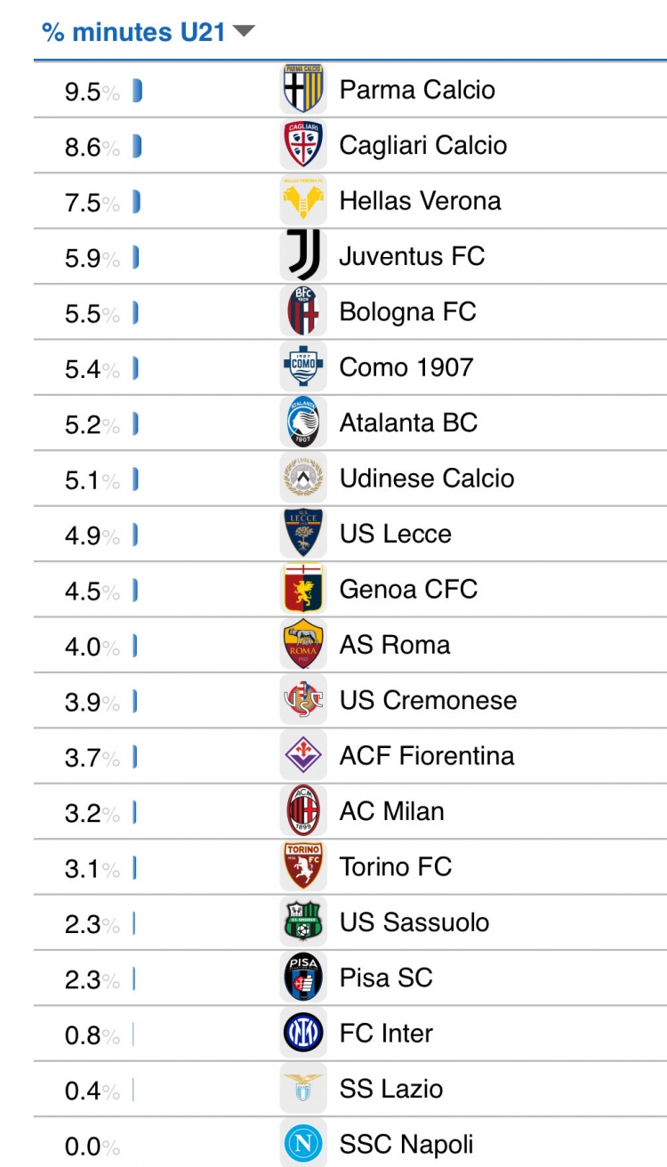 意甲为意甲各队U21球员出场时间占比情况: